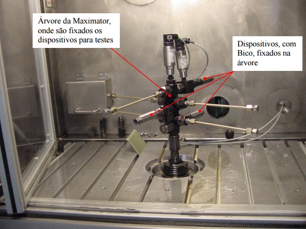 Observa-se aqui os dispositivos montados na ( árvore ) para o teste dos bicos, mas simultaneamente testando tubos de pressão. Obs. o teste de um produto não interfere no outro. aproveita-se assim a capacidade livre no equipamento para se realizar o ensaio com a mesma faixa de pressão.