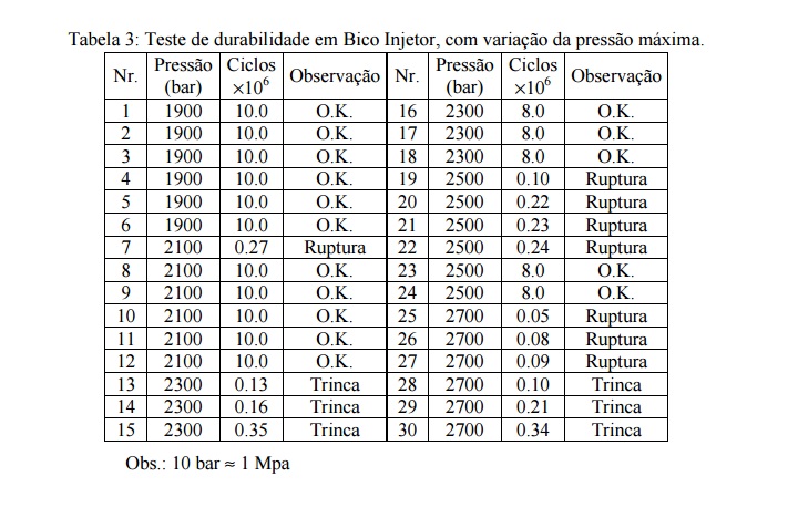 Os resultados acima representados mostram as faixas de pressão e número de ciclos quando ocorreram as rupturas nos bicos injetores testados.